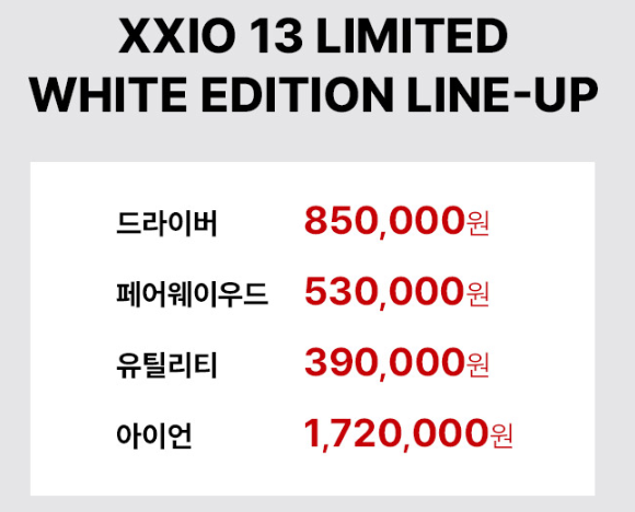 AK골프 화이트에디션 판매가격은 드라이버 85만원, 우드 53만원, 유틸리티 39만원, 아이언 172만원으로 세팅되어 있습니다. 화이트에디션의 경우 한정판으로 전 대리점 동일합니다.