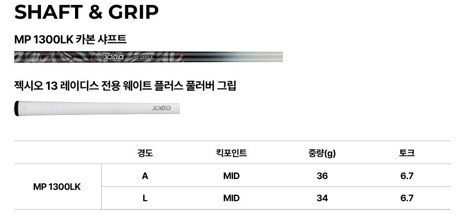 젝시오13 드라이버는 심미적으로 고급스러운 펄화이트와 스트로베리 레드 컬러의 포인트를 준 것이 특징입니다. xxio13 드라이버 샤프트 선택은 A와 L 스펙으로 구분됩니다. MP1300 LK 카본 샤프트와 전용 웨이트 플러스 그립을 사용합니다. 젝시오 13 레이디스 클럽 중량은 A 스펙과 L 스펙이 상이합니다.