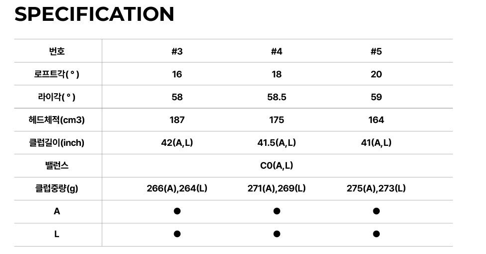 드라이버와 같이 A스펙, L스펙 두가지로 구매가 가능합니다. 젝시오13 A스펙의 샤프트 중량은 36그람, L스펙은 34그람입니다. 토크는 동일하게 6.7이며 우드3,4,5번으로 3가지로 나누어져 있습니다.